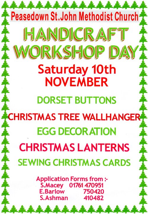 Our next Handicraft Workshop Day is on Saturday 10th November. It is an opportunity to share ideas and learn a new craft or expand your knowledge and enjoy meeting new friends. All are welcome, but children must be accompanied by an adult. The cost for the day is £5.00 per person to include tea/coffee and soup at lunchtime, but is exclusive of materials. No experience is needed, but booking is essential.